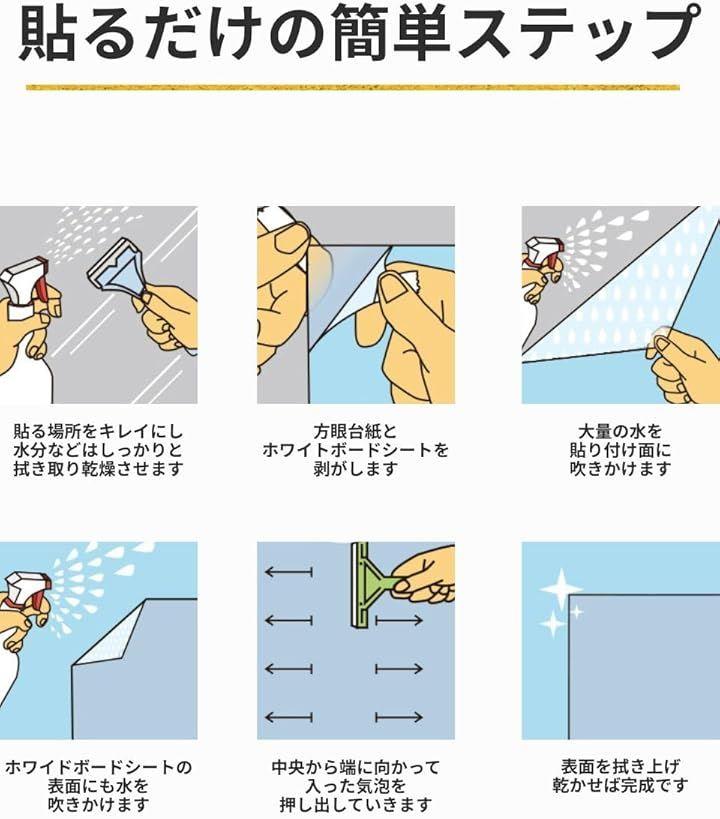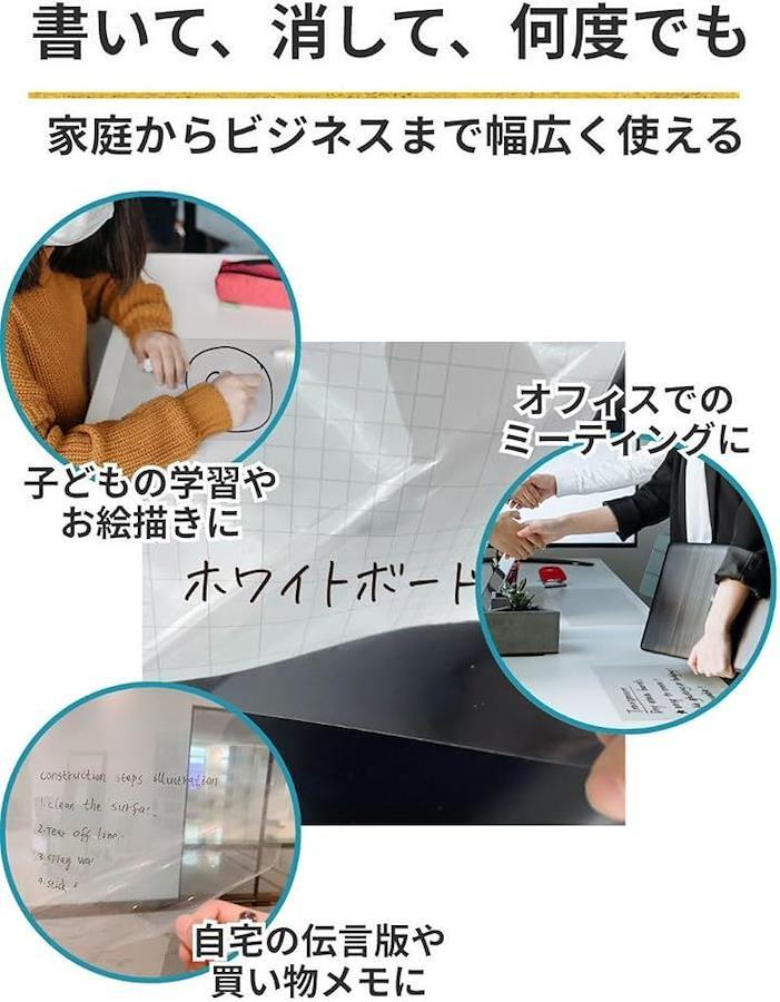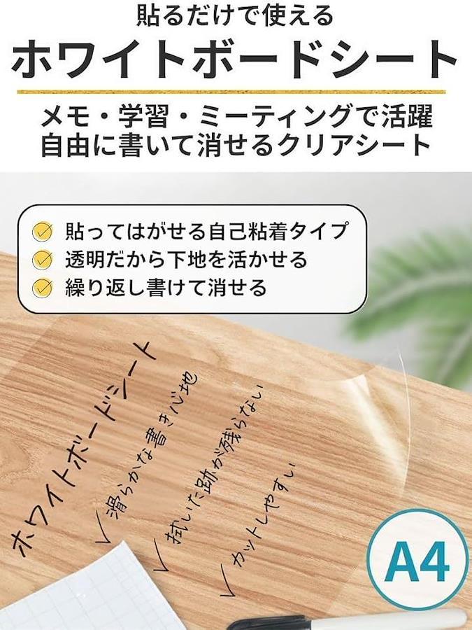 「貼って使える透明ホワイトボードシート」壁やガラス、滑らかな表面の木材、冷蔵庫など平滑な面に貼るだけで使える透明タイプのホワイトボードシートです。
