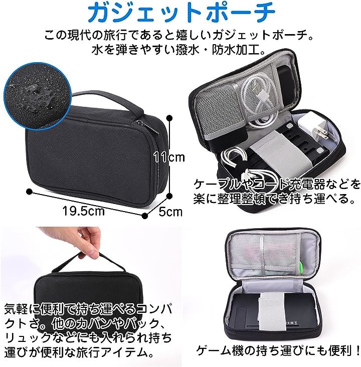 なにかと現地での情報収集や移動の方法、撮影や連絡などなど、あらゆる場面で必要となる携帯電話や各種デバイスを充電するモバイルバッテリーや、USBケーブルなど、それらを楽に保管し・持ち運び・整理整頓するガジェットケース。