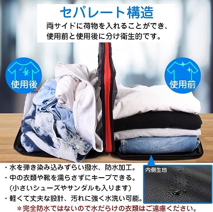 両サイドにセパレートになっているので、衣類を使用前と使用後に分けることができ、また水を弾き染み込みずらい防水・撥水加工で、中の物を濡らさずにキープできます。