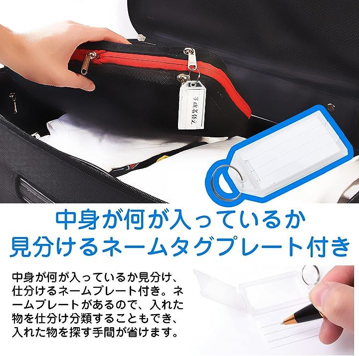 旅行用 圧縮袋 衣類 (トラベルポーチ)Mサイズ約:35x25x4cmと、 何が入っているかの目安となるネームタグプレート(約30mmx72mmサイズ)付き。