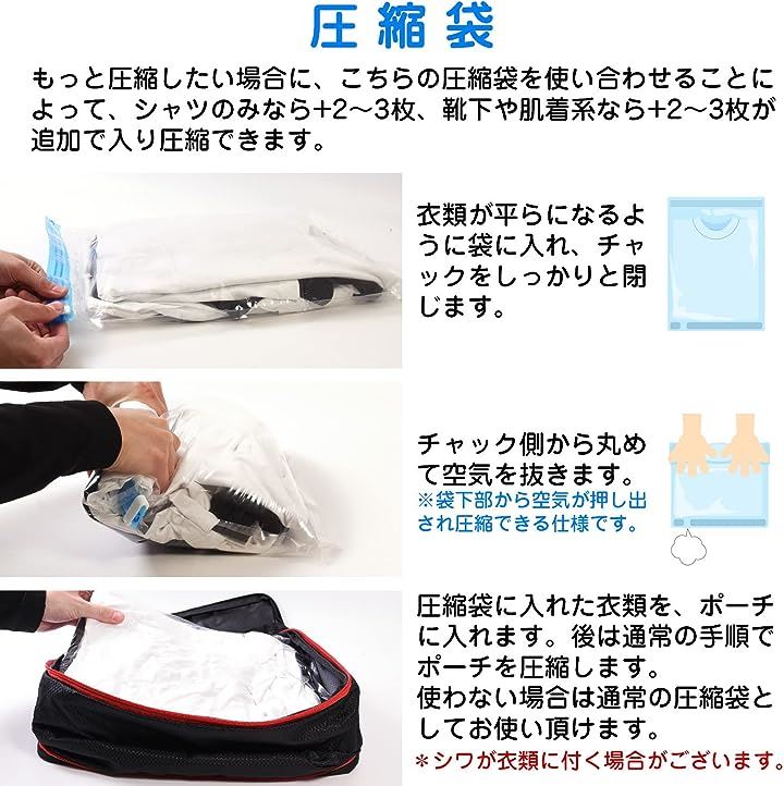 普通の圧縮袋では大変な手間も、こちらの圧縮袋は掃除機を使わず圧縮が可能な、圧縮袋 旅行用 衣類 となっており、ポーチと組み合わせることにより、更にスペースを得て圧縮し、多くなる荷物を少しでも軽減し、また圧縮袋単体としても使うことが可能です。