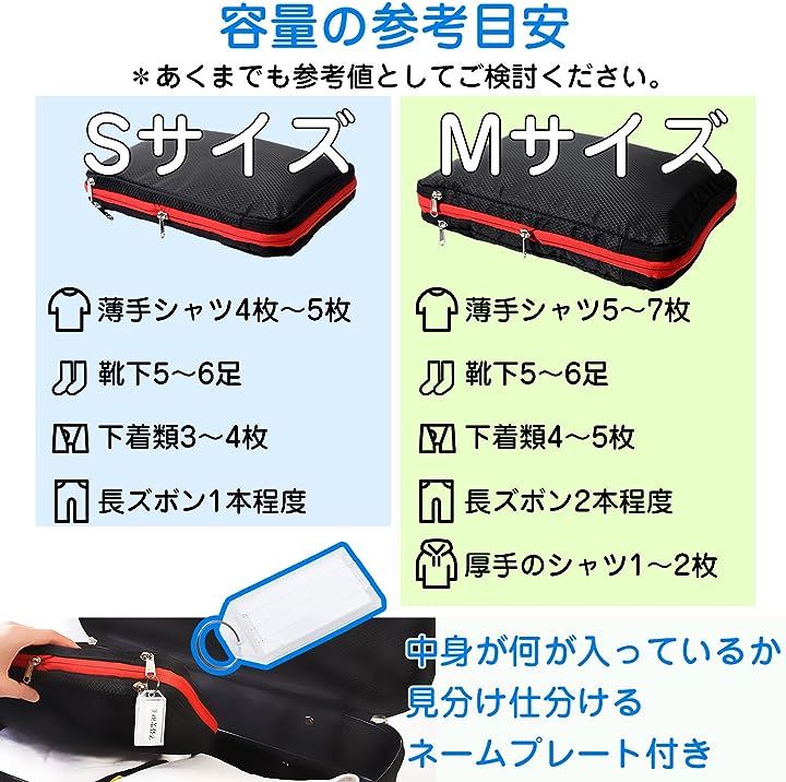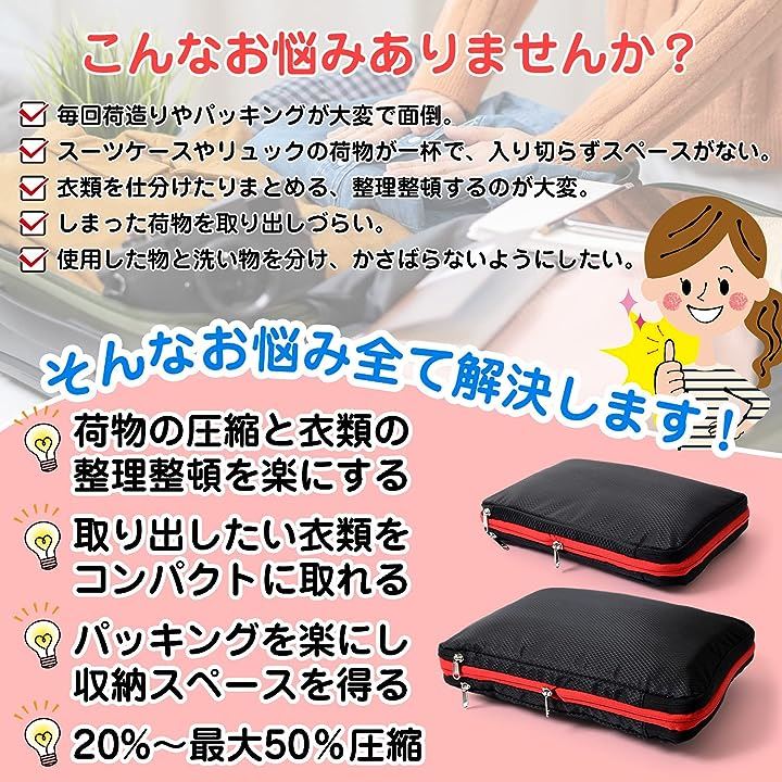 毎回の荷造り、パッキングでの手間を省き、荷物が多くて入り切れない・かさばる衣類を圧縮し、荷物を小さくコンパクトにし、収納スペースを得ることにより、お土産や違う荷物、シューズやサンダルなども入れることも可能です。