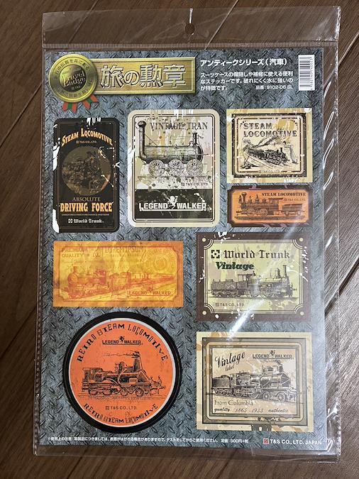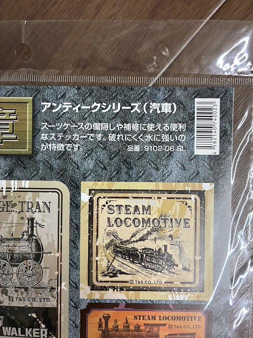旅の勲章アンティークシリーズの汽車ステッカー、8個セットです。スーツケースの傷隠しや補修に使える便利なステッカーで、破れにくく水に強いのが特徴です。様々なデザインの機関車が描かれており、レトロな雰囲気が魅力です。
