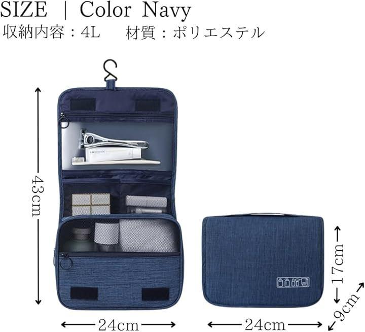 「吊り下げ式」アメニティなどを収納出来ることに加えて、丸ごと吊り下げて使用することができる、便利なトラベルポーチです。