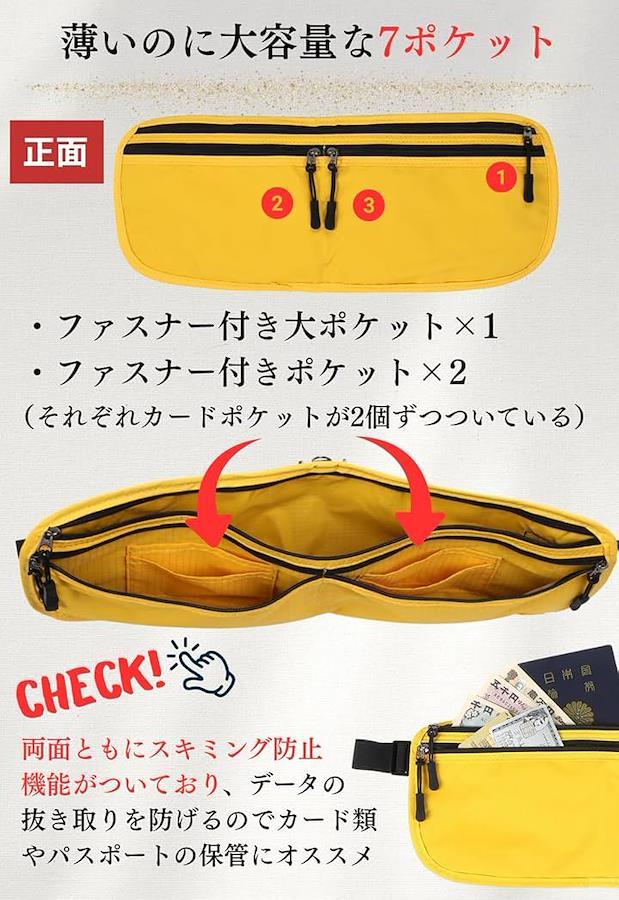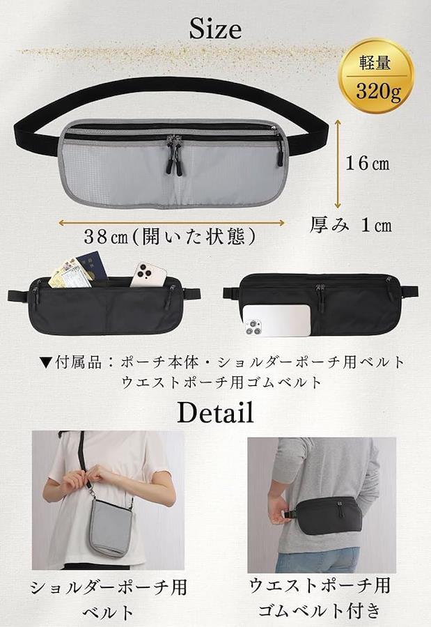 「サイズ」 縦16cmx 横38cm(開いた状態)x 厚さ1cm、重さ 320g 「材質」 撥水ポリエステル、RFID素材 「カラー」ブラック、ダークグレー、ライトグレー、レッド、イエロー、ネイビー 「使い方」ウエストポーチ、ボディバッグ、ショルダーポーチ、首掛け