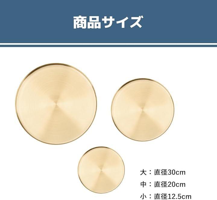 「商品詳細」サイズ:(大)直径30cm、(中)直径20cm、(小)直径12.5cm 重量:(大)約820g、(中)約330g、(小)約140g 材質:ステンレス 色:ゴールド サイズバリエーション:30cm、20cm、12.5cm