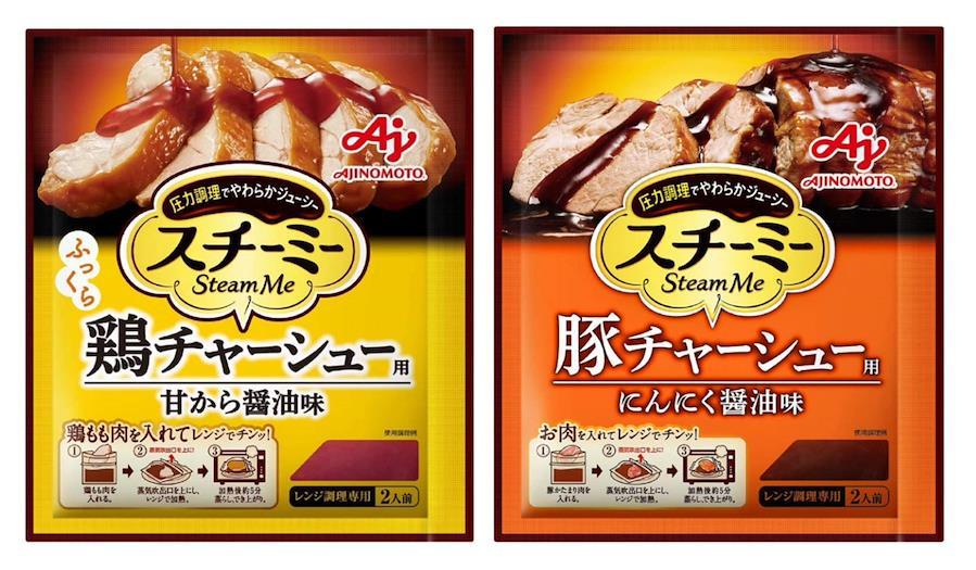 味の素製品、2商品のセット品です。 圧力スチーム調理パウチに肉を加えレンジで調理するだけで、簡単に、短時間で、美味しいかたまり肉メニューが楽しめます。 圧力スチーム調理パウチに鶏肉を加える、鶏チャーシュー用 90gと豚かたまり肉(豚肩ロースまたは豚バラ)を加える豚チャーシュー用 60gのセット商品です。 ごはんとの相性も抜群で、食卓のメインとなる料理を簡単に作ることができます。