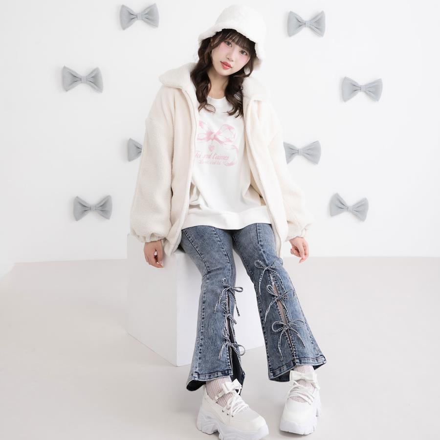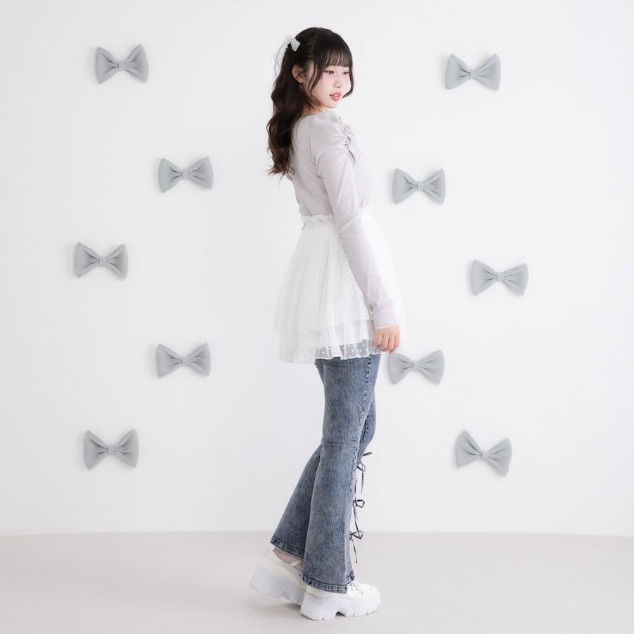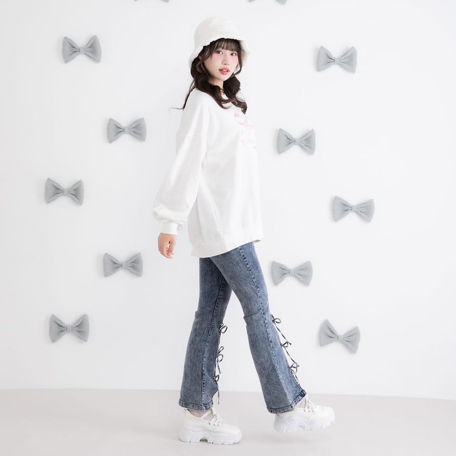 シンプルながら、3つリボンがガーリーさをプラスしてくれるフレアパンツ。