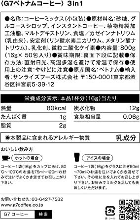 世界第二位のコーヒー産地であるベトナムにおいて圧倒的シェアを誇るG7インスタントコーヒー濃厚で深みのある味わいとミルクの甘さが絶妙に合わさり、なめらかで奥深い風味が口いっぱいに広がります。1袋あたり、たんぱく質1g、脂質2g、炭水化物12g、食塩相当量0.06g