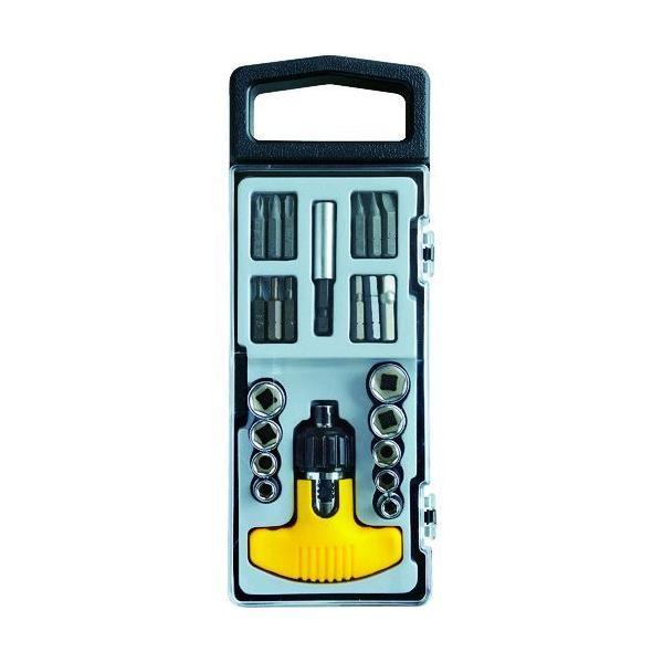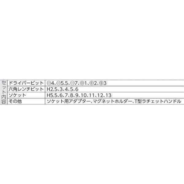 ●セット内容:ドライバービット[[-]]4、5.5、7、[[+]]1、2、3、六角レンチビットH2.5、3、4、5、6、ソケット5.5、6、7、8、9、10、11、12、13、ソケット用アダプター、マグネットホルダー、T型ラチェットハンドル