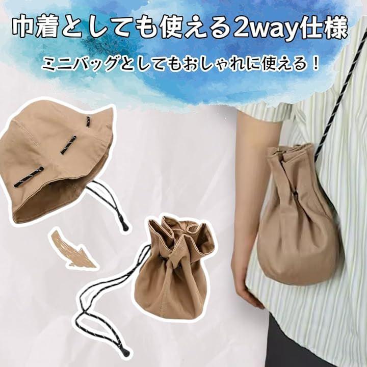 ・ ハット だけでなく、また、紐を締めると、 斜め掛け や 手提げ用 の 巾着袋 になる多機能帽子です。