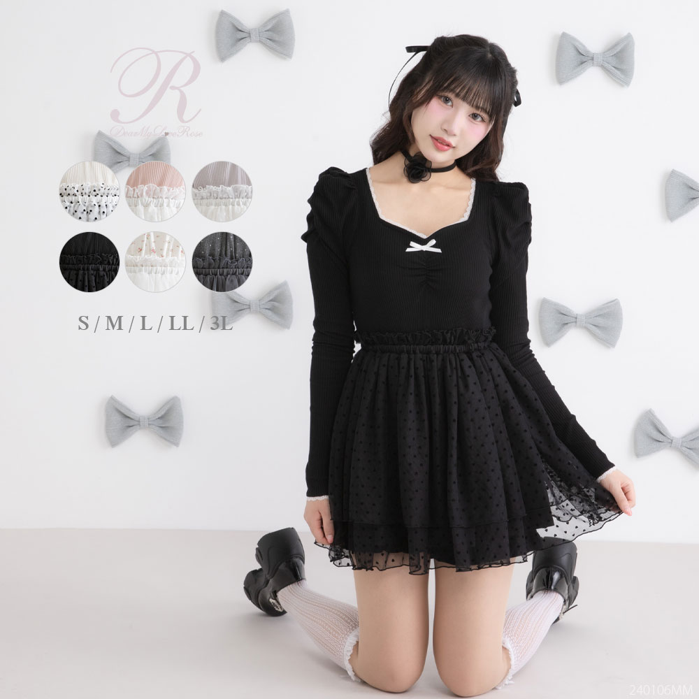 上半身は襟ぐりや袖口のレース、リボンが可愛らしく、パワショルでプリンセスみのあるガーリーなデザイン◎