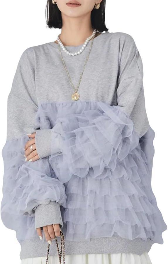 しなやかでシンプルな薄手のスウェットに、繊細でフェミニンなチュールをたっぷりとのせたトレンド感溢れる1枚が大活躍。