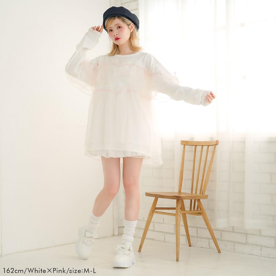 ふわっふわのたっぷりチュールフリルが可愛いチュニック丈ロンTのご紹介。