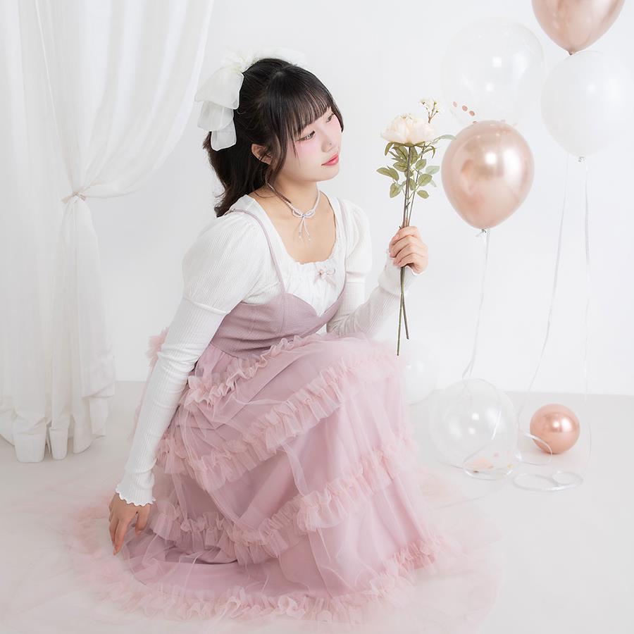 ボリューミーなチュールティアードが可愛く、まるでお人形さんのようになれちゃうキャミワンピです。