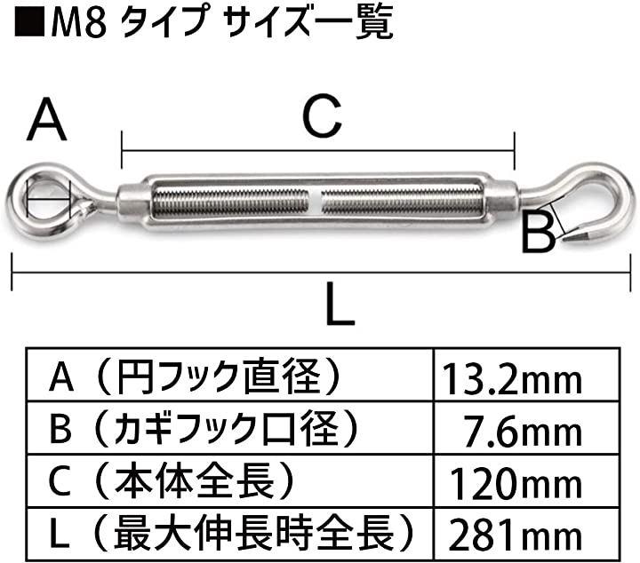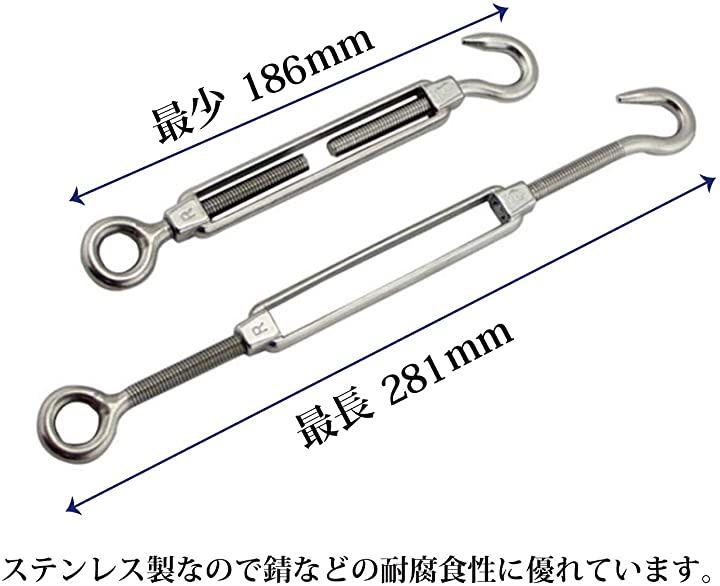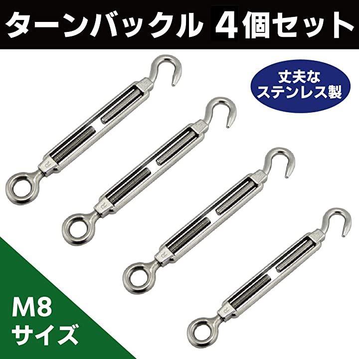商品内容:ターンバックルM8サイズ4本入り片側カギ型フック・片側円型フック