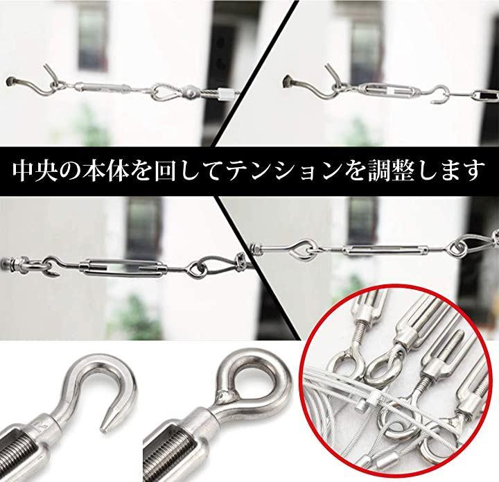 ・両サイドのフックにワイヤーロープなどを括り付け、中央部分を回転することでしっかりとテンションを掛けることが簡単にできます。