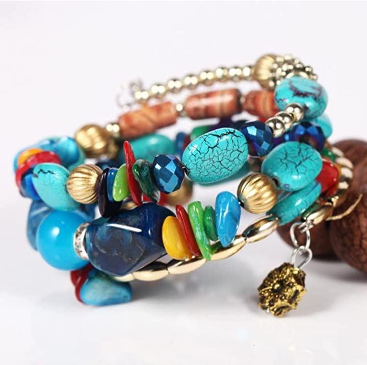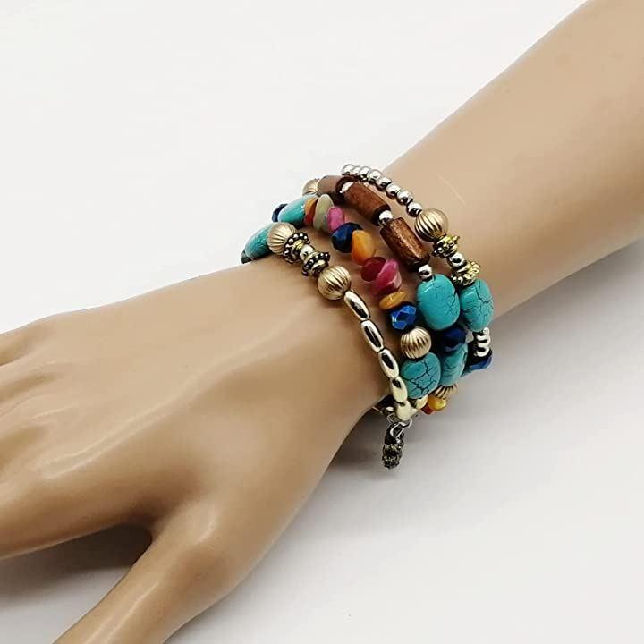ターコイズカラーのブレスレットは巻きつけタイプだかららくらく簡単装着出来ます。