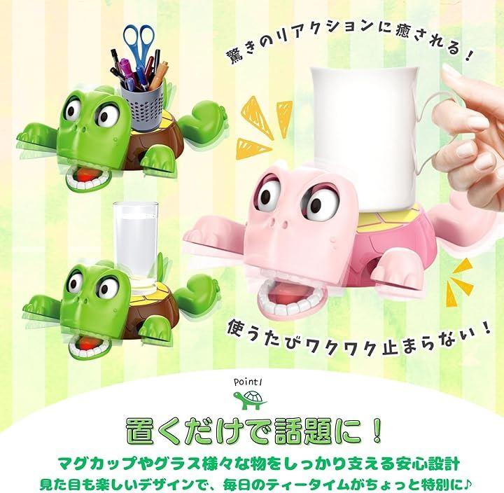 「驚きのギミックで癒される。」コップを置くと、なんと亀がビックリ。手足をバッと上げて、驚いた表情を見せるユニークな動きで癒しと笑いを提供してくれるコースターです。