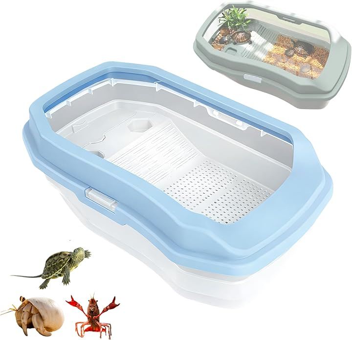 底受け皿内寸:18.5cmx32.5x8.5cm/材質:PP/カラー:ブルー 構成:上部フレーム・飼育トレイ・底部受け皿(3点) 想定生体:カメ幼体~小型1匹、ヤドカリ・小型両生類など/室内専用 *サイズは生体の甲長を基準に選定ください。