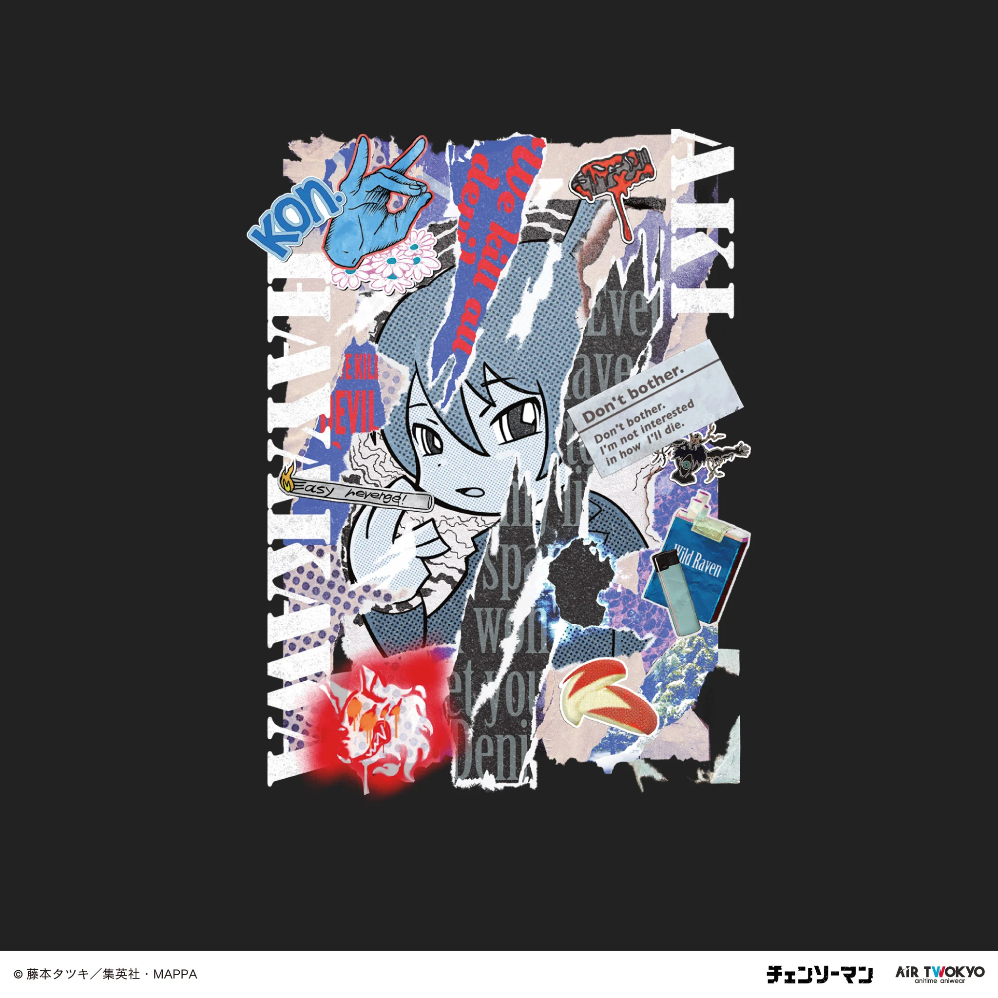 早川アキをモチーフとしたアイコン、印象的なシーン、台詞を組み合わせたデザインTシャツ。ストリートアートからインスパイアしたデザインであり、デシーンデザイン表現(グラフィックを切り貼りする手法)を用いている。デンジに切ったリンゴや未来の悪魔等、早川アキに関連するアイコンが散りばめられた1枚。