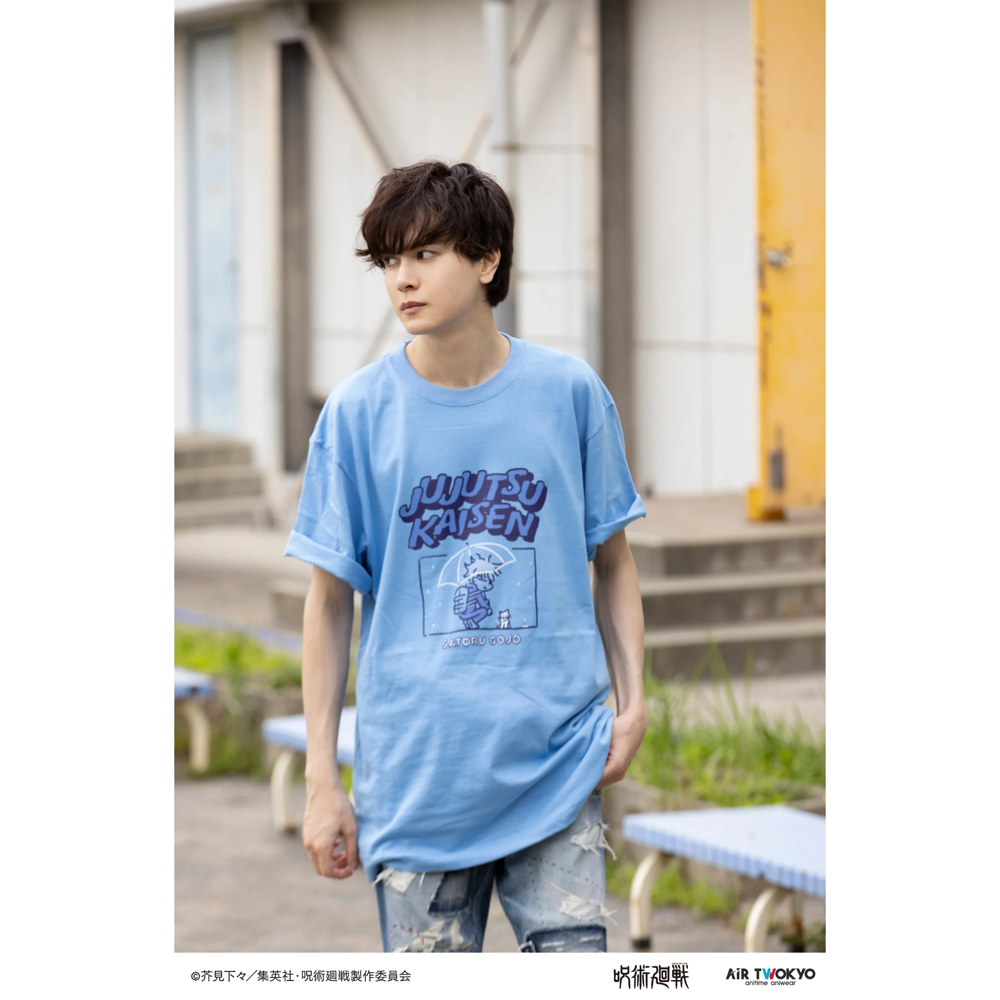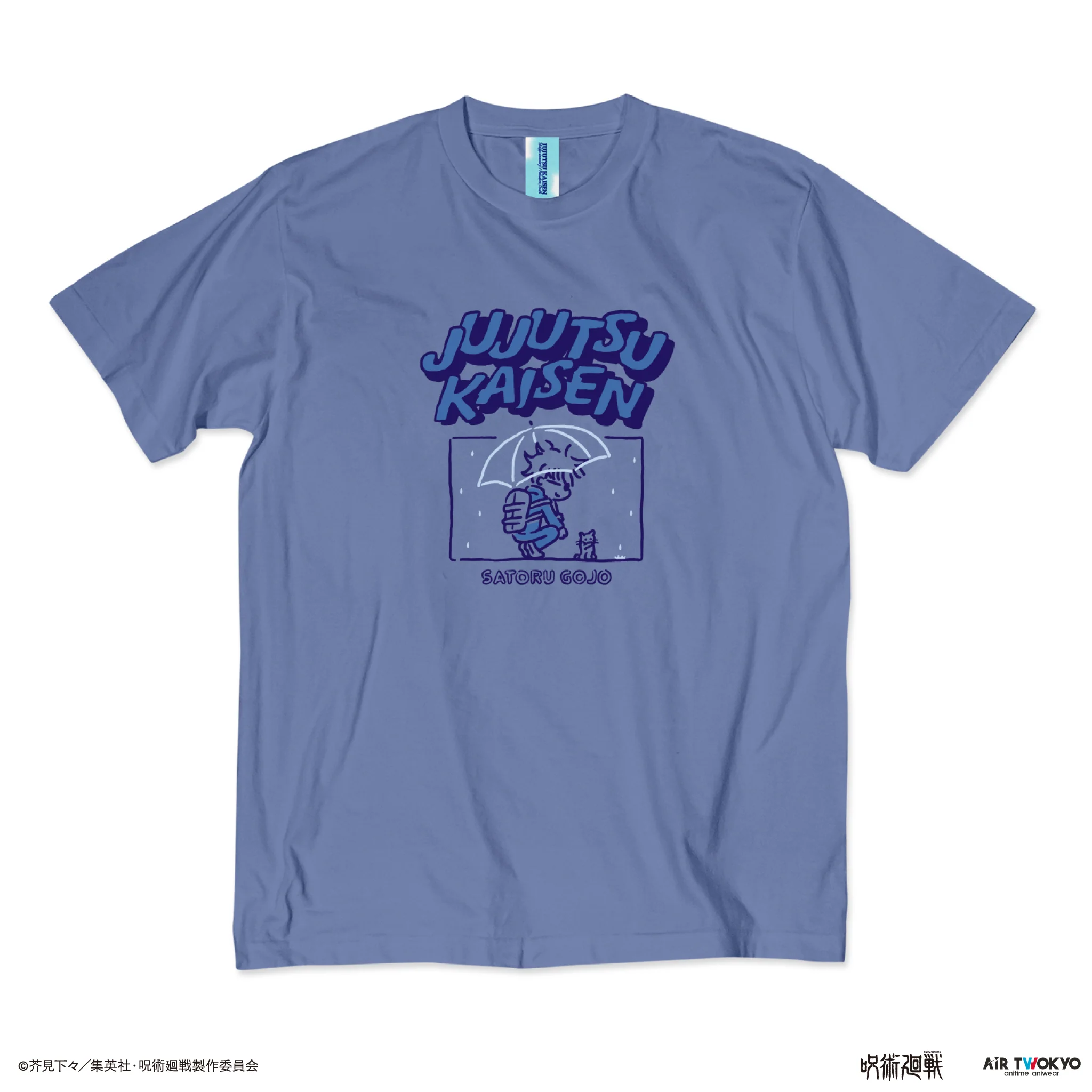 エンディングのワンシーンをデザインしたTシャツ五条悟が雨の中、猫を見つめているシーンを可愛いデフォルメ姿でデザイン。背中にはエンディング最初のシーンに登場する金魚がデザインされている。Tシャツの生地はコットン100%の5.6オンスのセミコーマ糸を使用し、着心地や素材感にこだわった上質な仕上がりに。