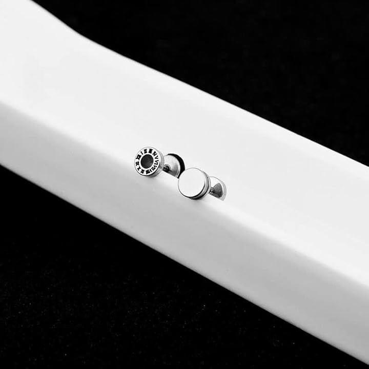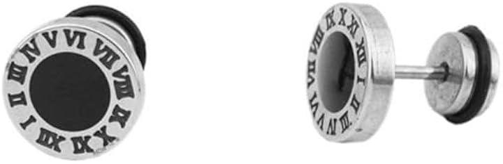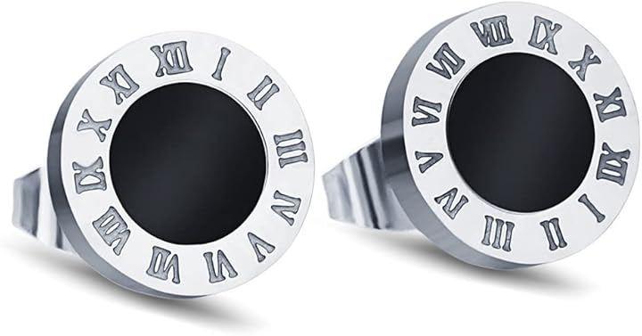 「 お洒落なローマ数字スタッドピアス 」丸形で中央にはブラックサークル、それを取り囲むようにローマ数字が配列しシンプルかつ上品さを演出します。