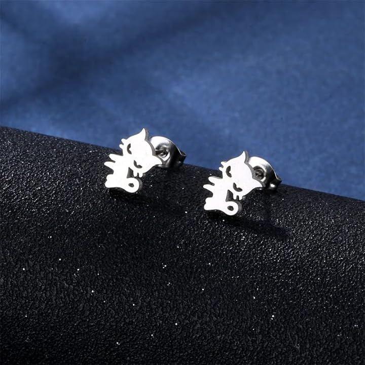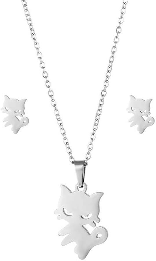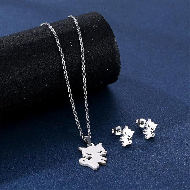 Two Cat Earrings with Necklace, Hypoallergenic, 3-Piece Set, Perfect for Christmas or as a Gift for Her. Cute Small Animal Pet Accessories, Stainless Steel.