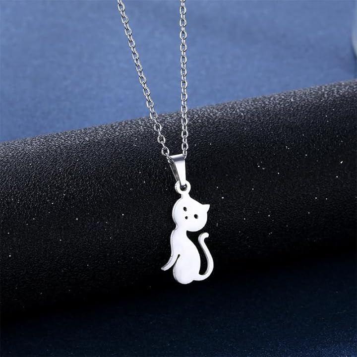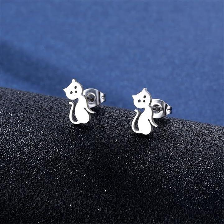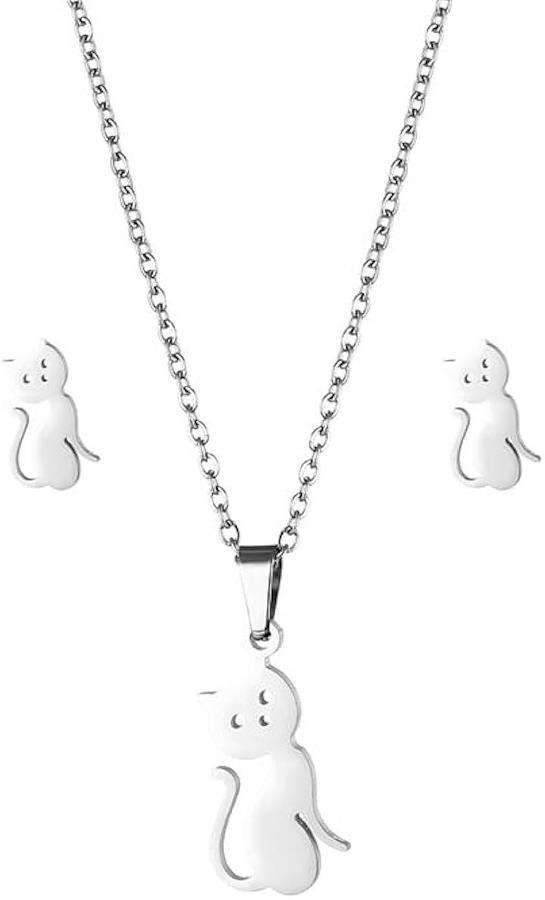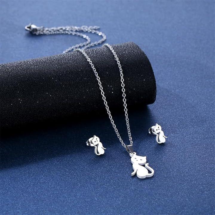 Two Cat Earrings with Necklace, Hypoallergenic, 3-Piece Set, Perfect for Christmas or as a Gift for Her. Cute Small Animal Pet Accessories, Stainless Steel.