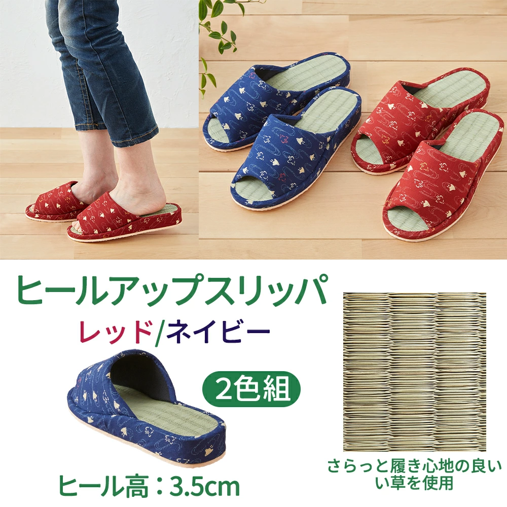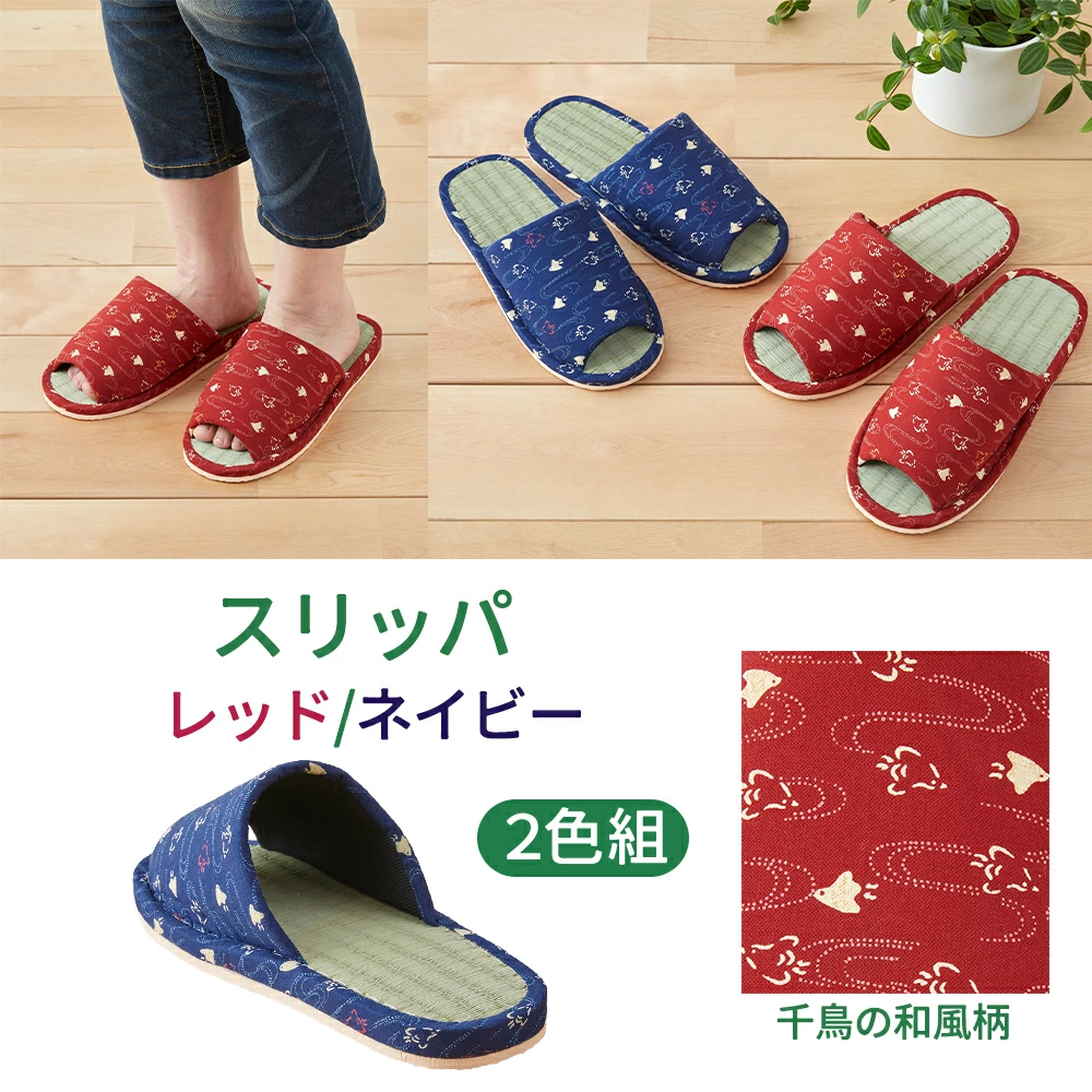 【商品名(JAN)】い草スリッパ 千鳥 2色組 XM-955(4968812429111)い草ヒールアップスリッパ 千鳥 2色組 XM-956(4968812429128)【商品サイズ(約)】[スリッパ]全長:約26cmヒール高:約2cm適用サイズ:約22~26cm片足約75g[ヒールアップスリッパ]全長:約25cmヒール高:約3.5cm適用サイズ:約22~24cm片足約90g【材質】生地:ポリエステル中敷:い草中材・底材:EVA樹脂【製造国】中国【商品情報】さらっと履き心地の良いい草を使用。可愛い千鳥の和風柄のスリッパです。レッド・ネイビーの2色組。※洗えません。※柄の出方が異なります。