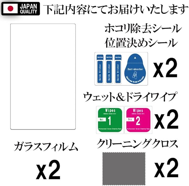 ガラスフィルム x2、ウェットワイプx2、ドライワイプx2、埃吸着シートx2、クリーニングクロスx2、パッケージ裏面貼付説明書付属。