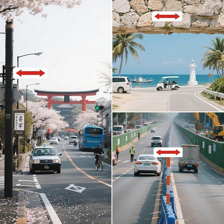 「反射機能」この矢印看板は背景全面が反射材で出来、夜間でも目立ちやすくなっています。