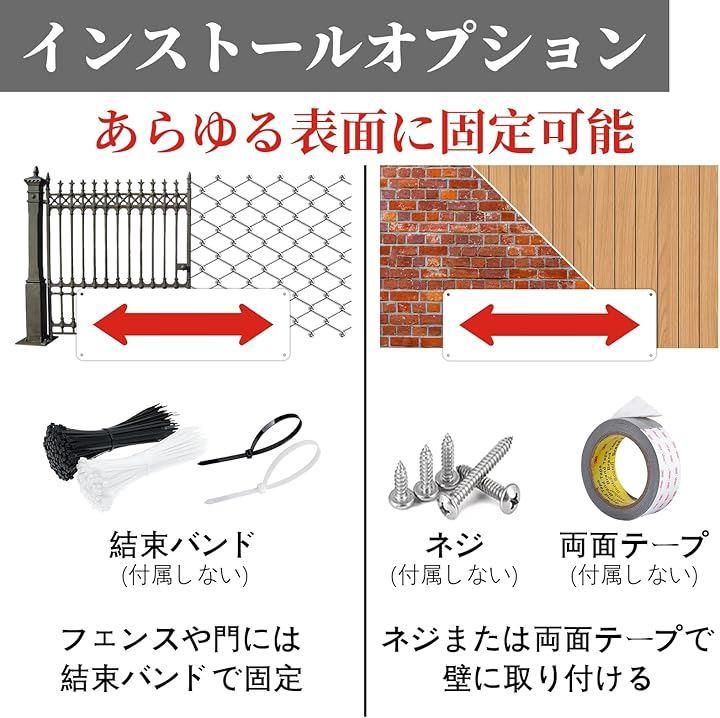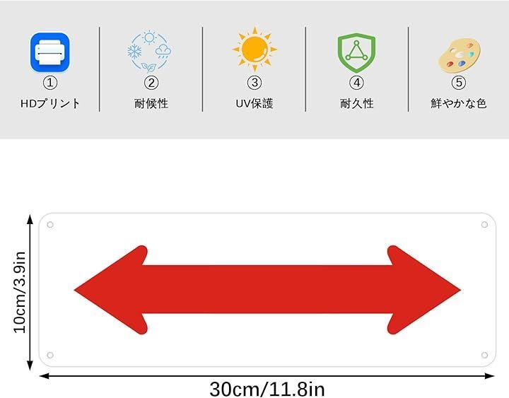 「商品仕様」サイズ:300x100mm、厚さ:0.85mm、材質:アルミ製看板、セット内容:2枚入り。