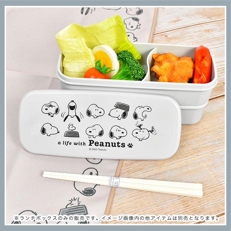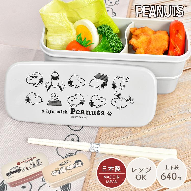 【2段ランチボックス】スヌーピーのデザインがかわいい2段ランチボックス。スリムな見た目でも上下段合わせて640ml入り、女性やお子様にちょうどいいサイズです。フタを外せば電子レンジOK!内蓋に収納できるお箸&ゴムバンド付きで持ち運びにも便利です◎同じシリーズのランチグッズを揃えるのもおすすめ♪