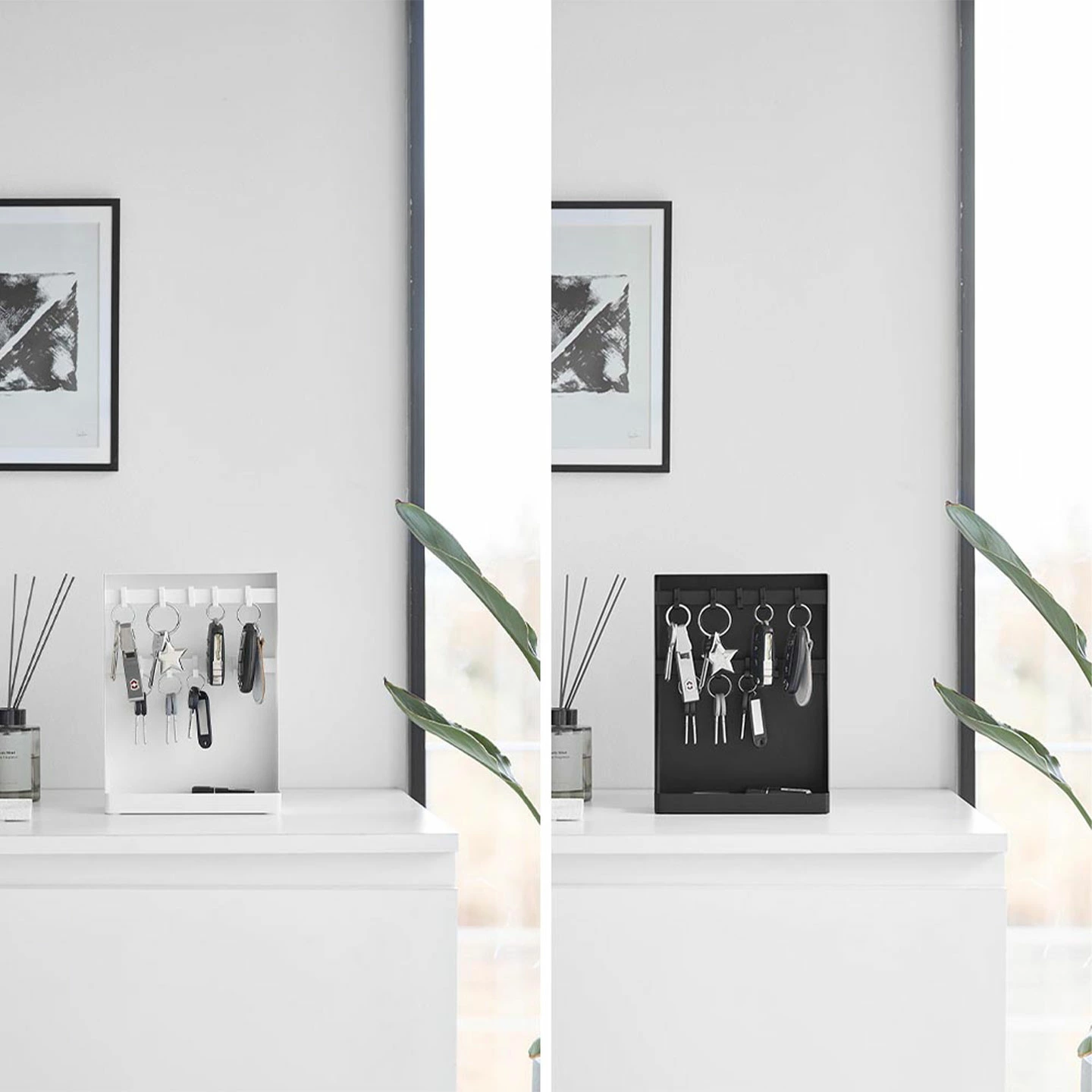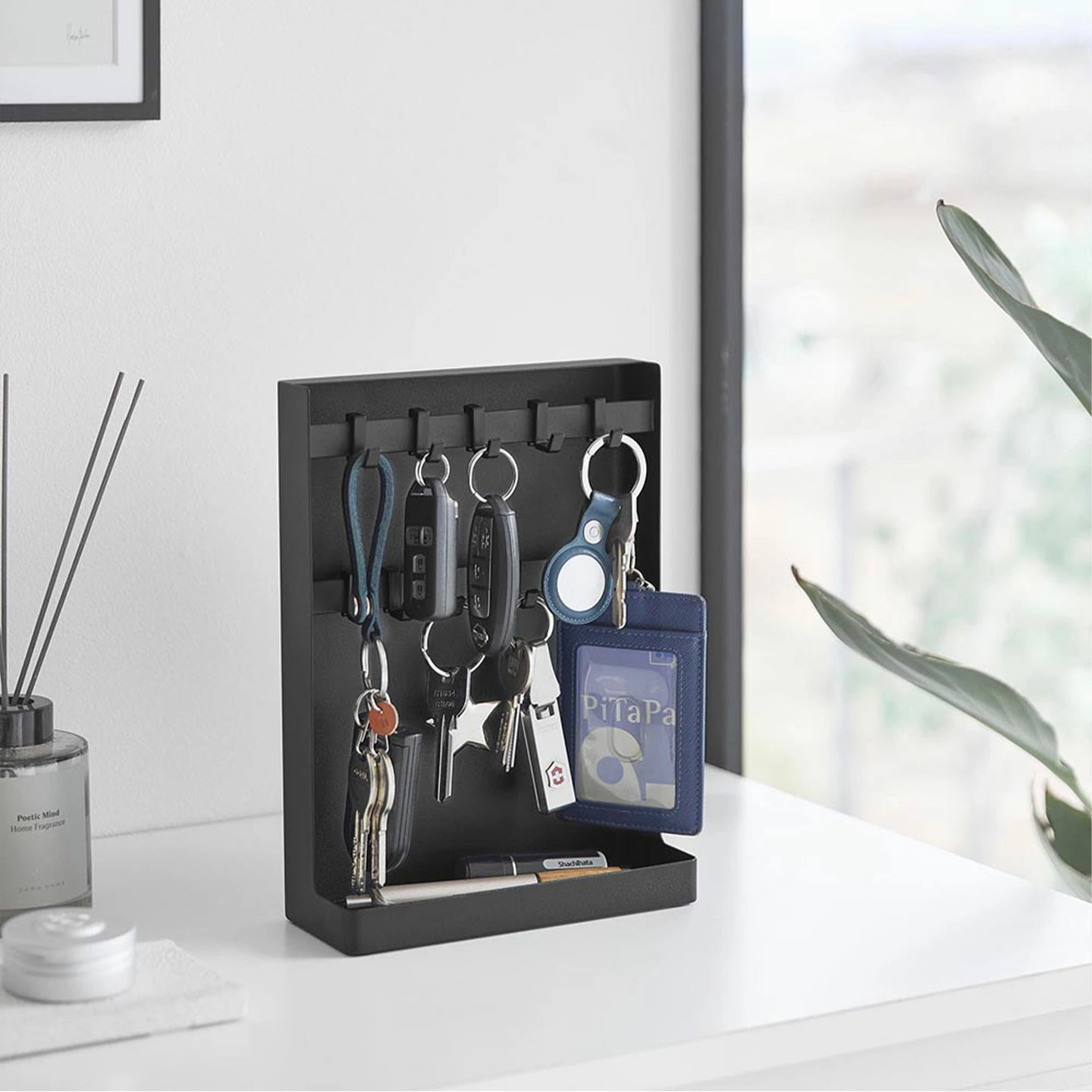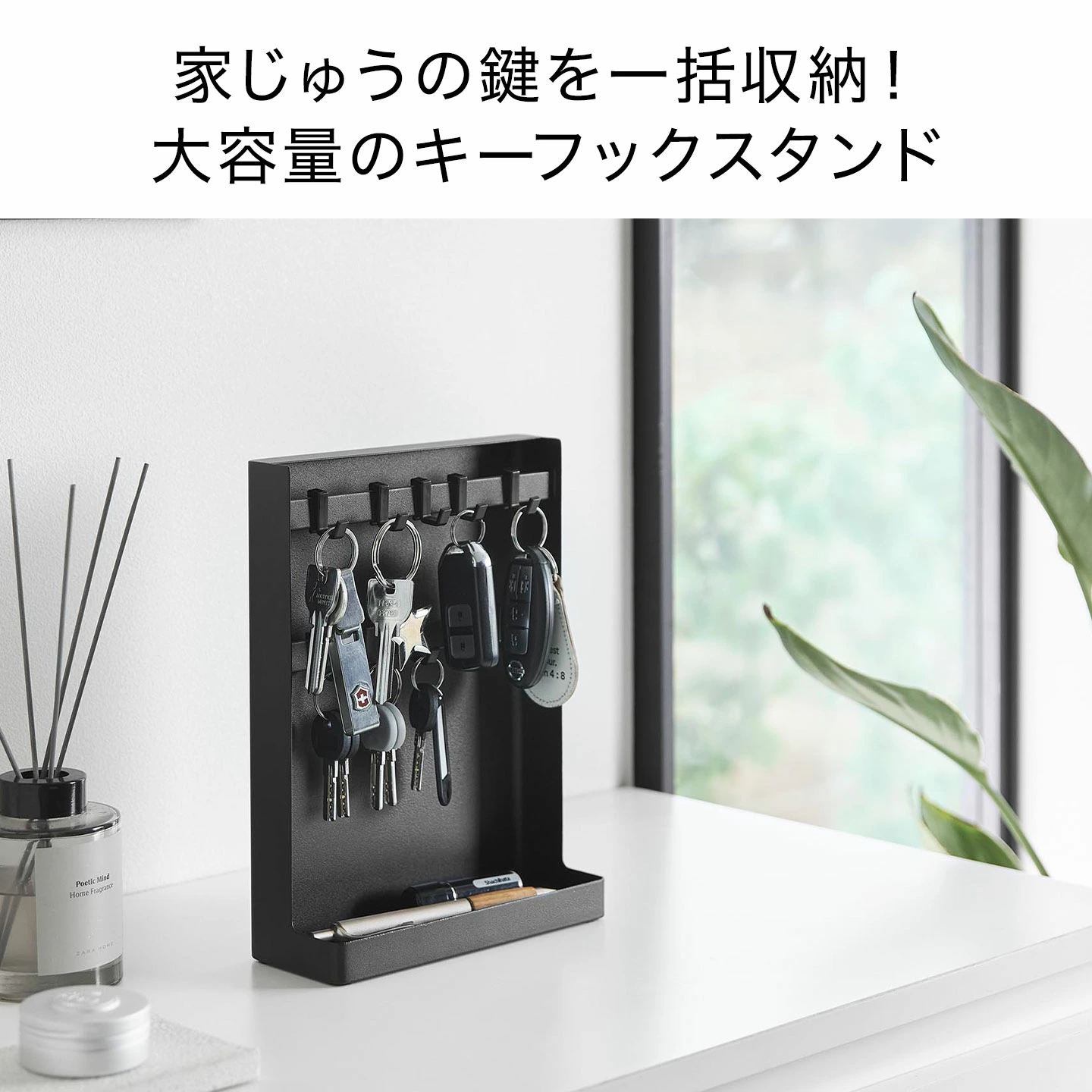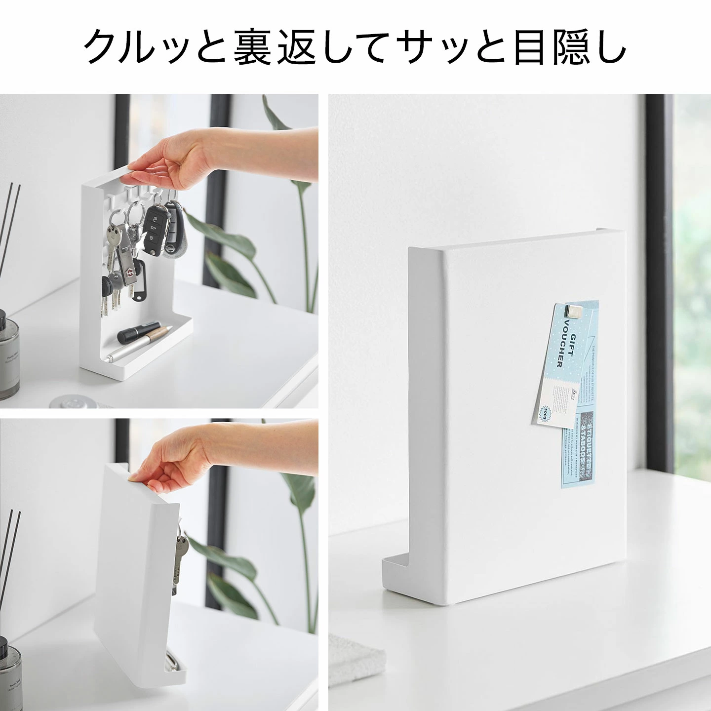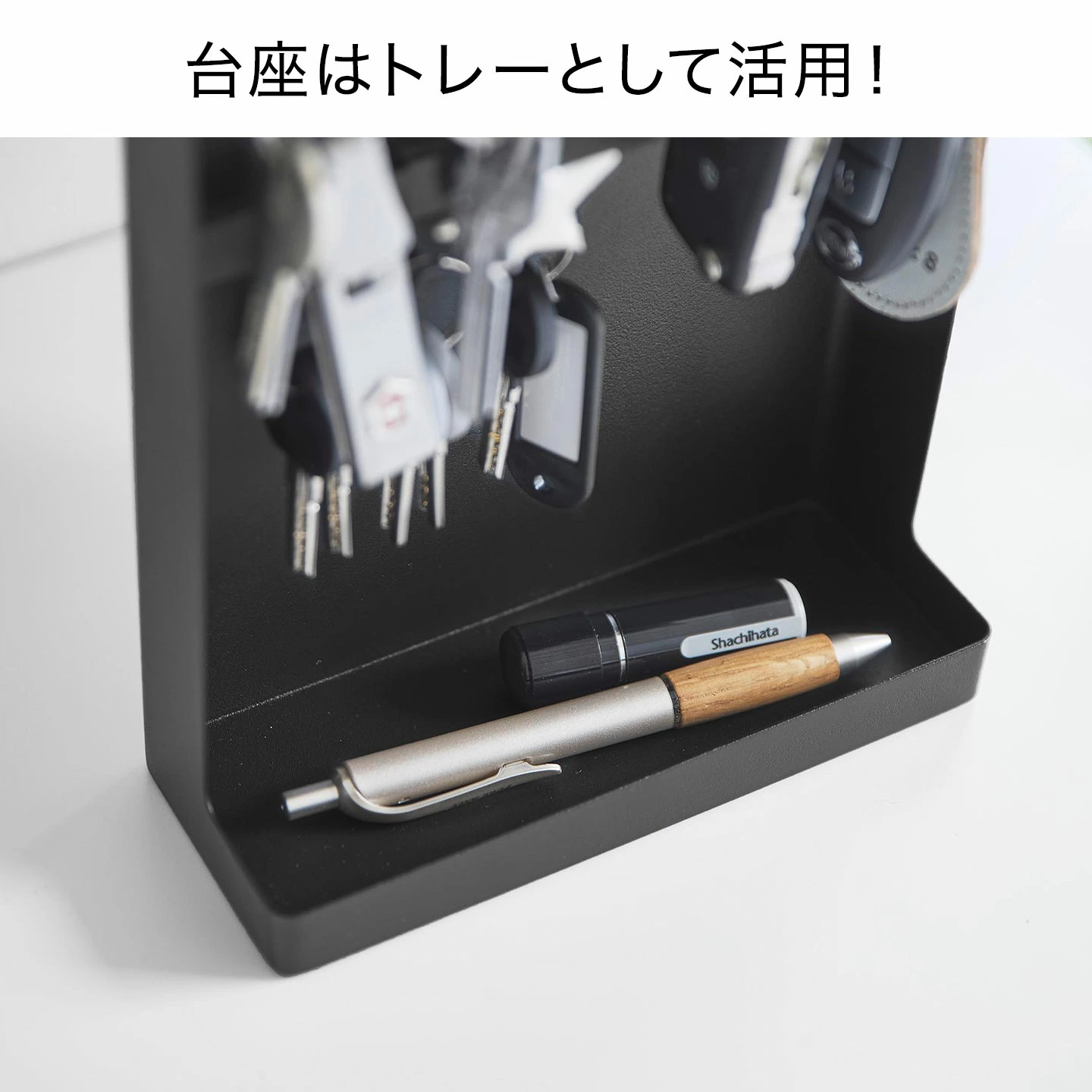 【目隠しキーフックスタンド 2段】使わないときはクルッと回してサッと目隠しできる、キーフックスタンドです。安定感のあるスチール製で、鍵をスッキリまとめて収納できます。奥行きの異なる2段構造のフックで取り出しやすく、収納力もアップ。上段にはパスケースなどを、トレーには印鑑やペンなどの小物を収納できます。フックは可動式で、お好みの位置にレイアウト可能です。