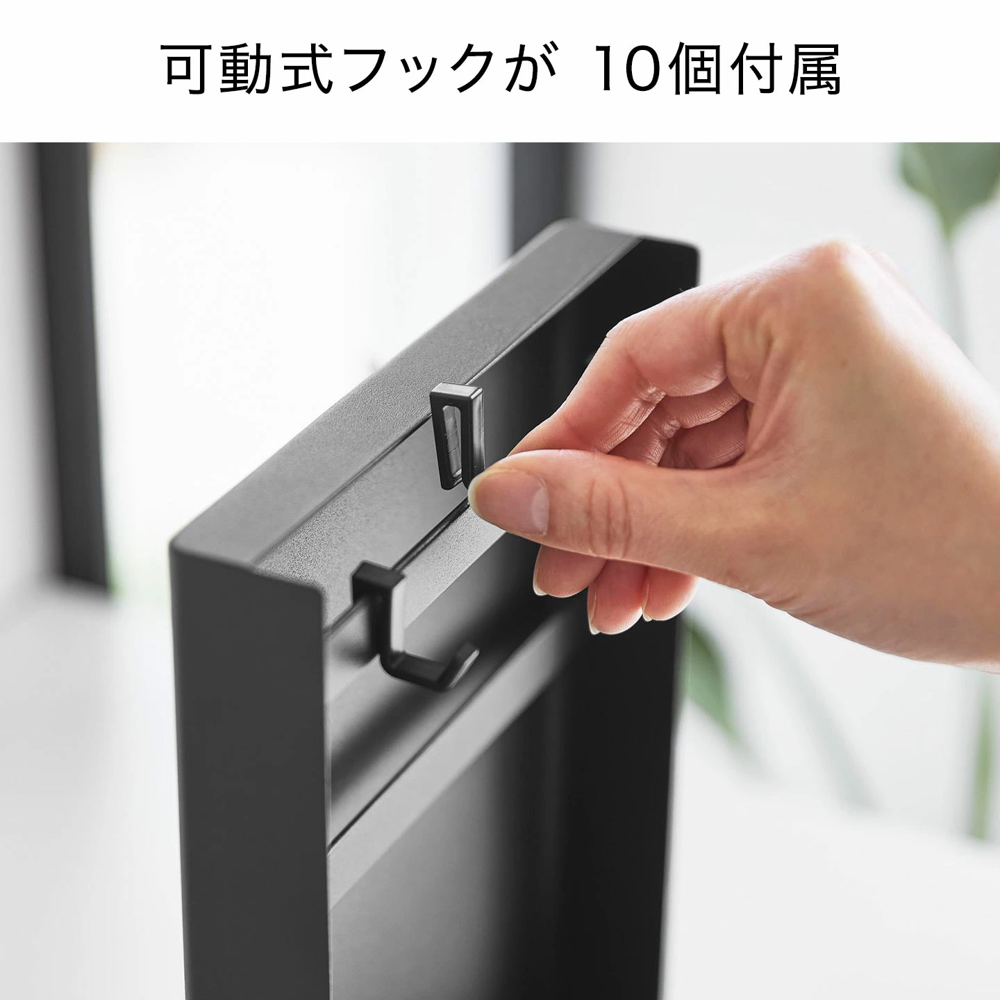 【目隠しキーフックスタンド 2段】使わないときはクルッと回してサッと目隠しできる、キーフックスタンドです。安定感のあるスチール製で、鍵をスッキリまとめて収納できます。奥行きの異なる2段構造のフックで取り出しやすく、収納力もアップ。上段にはパスケースなどを、トレーには印鑑やペンなどの小物を収納できます。フックは可動式で、お好みの位置にレイアウト可能です。