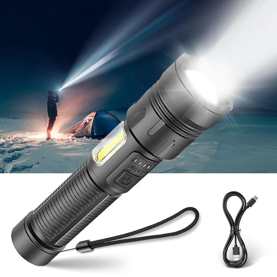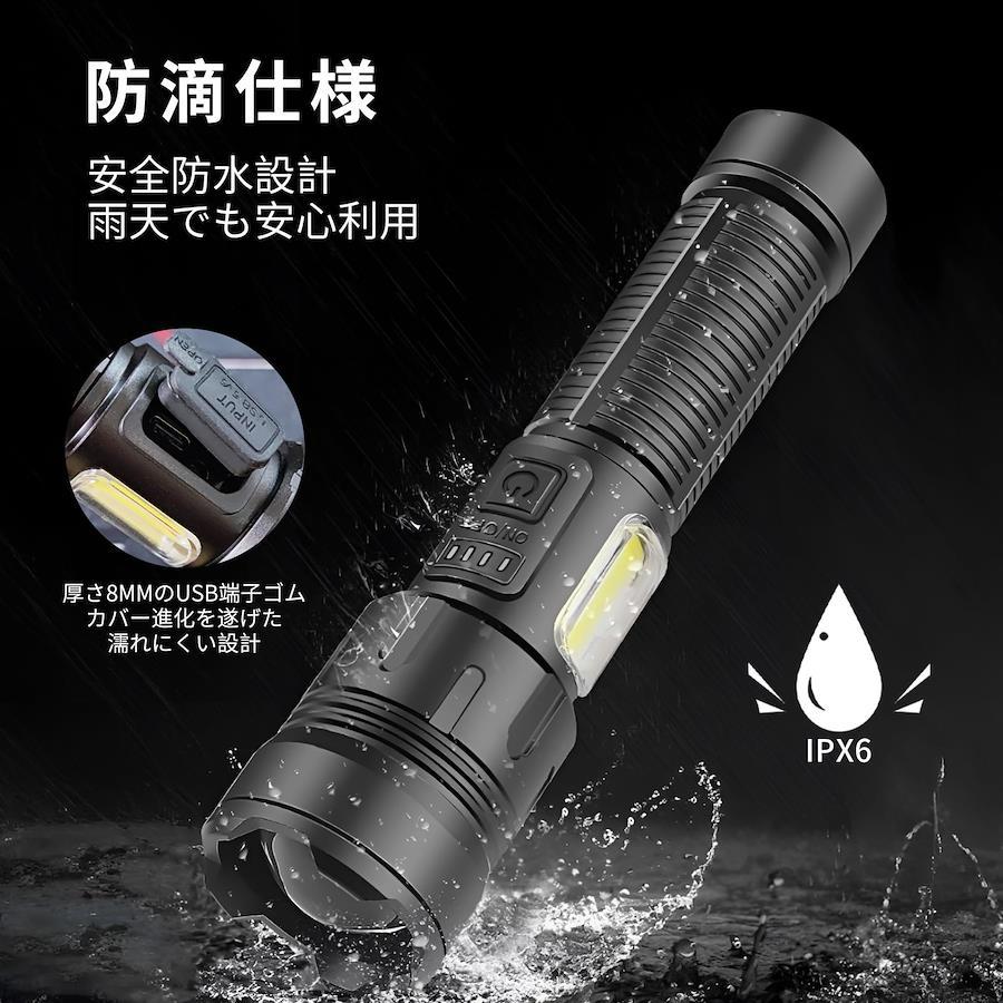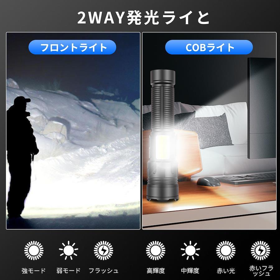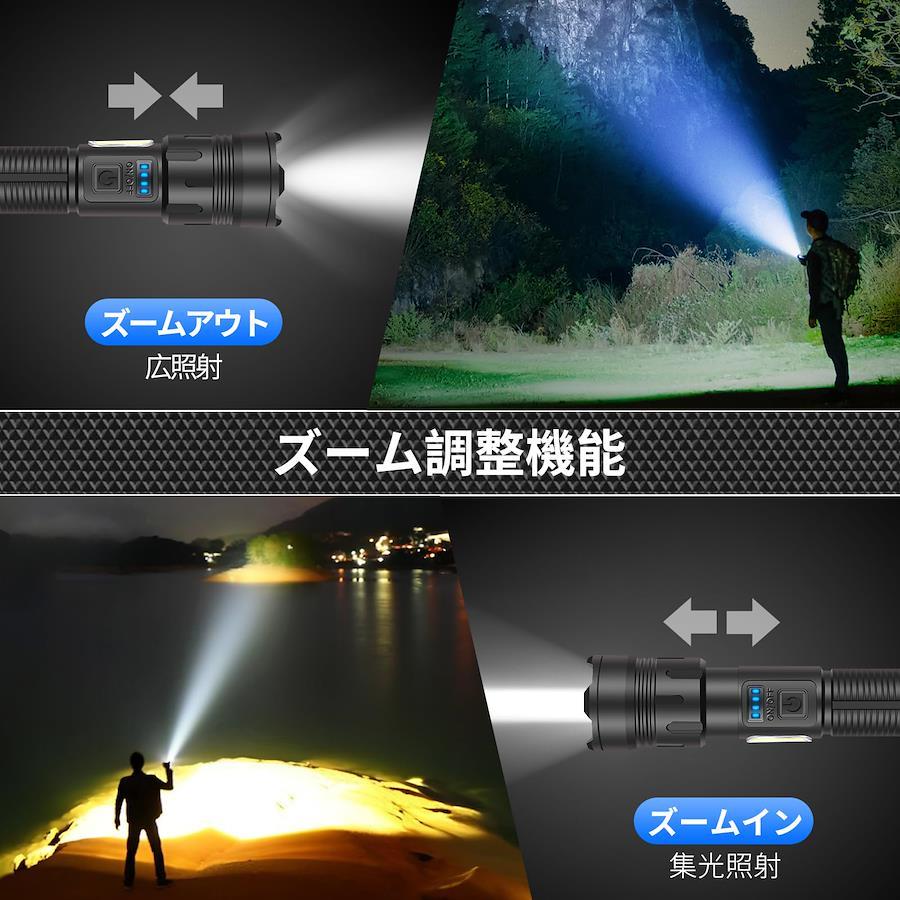 【超高輝度 軍用懐中電灯】OTVEE 懐中電灯 LEDライト ハンディライト フラッシュライト 充電式 強力 小型 軽量 実用点灯最大20時間 ズーム式 COB作業灯 7モード調光 IPX6防水 停電 作業 夜釣り キャンプ 登山 避難対策 軍用規格に基づいて製作されて超高輝度LEDライトとcob作業灯があります。実用点灯最大20時間です。7段階の点灯モードがあって、各種の場面に対応できます。耐衝撃耐腐食に強い堅牢設計を採用し、寿命は100000時間です。防水等級IPX6に準拠しているので、雨にも使えます。夜間のペットの散歩、防犯監視、夜釣り、キャンプ、登山、アウトドア、停電時、非常灯など様々なシーンでご使用いただけます。【超高輝度&7つのモード&ズーム機能】新世代の超高輝度2000ルーメンのLEDコンポーネントを採用した、XHP160のLED電球と組み合わせることで、より良い照明効果を達成することができます。照明距離は1000 mにも達することができます。7つのモードで調整できます。スイッチを押すと正面照射モードに入り、スイッチを素早く2回押すとCOB作業灯モードに入ります。いずれのモードも、スイッチを押すたびに、スモールモードに切り替えることができます。正面照射は強い光-弱い光-フラッシュの3モードで、COB作業灯は、高輝度-中輝度-赤色光-赤色閃光の4モードで、全部で7モードです。懐中電灯ズーム機能があり、ヘッドを軽くスライドせるだけで、広範囲の照明と遠距離の集光を自由自在に切り替えられます【Type-C充電式&大容量バッテリ搭載&バッテリー残量表示】4つのインテリジェンス指示ランプは、従来のスイッチ式表示ランプよりも正確に具体的な電力量を表示したり、電池容量低下による充電必要時をお知らせしたりできますので電源が急に切れる心配はありません。充電が必要な場合は、本製品付属のType-Cケーブルだけでなく他のType-Cケーブルも利用できます。5000mAh大容量バッテリ搭載、フル充電で通常の使用した場合、20時間の連続点灯が可能です【堅牢設計&耐衝撃&耐腐食&安全防水】過酷環境での使用を想定した設計により、耐衝撃性に優れています。高品質のアルミニウム合金表面が陽極酸化処理されており、耐腐食性や摩耗性に強く、より長くご使用いただけます。この懐中電灯は誤って高いところから落としても、大きな損傷はなく、正常に使用できる。また、窓を破って緊急脱出するほどの頑丈さを持っています。防水等級IPX6に準拠しているので、日常生活における雨水などによる水滴の付着や水しぶきにも耐えられ、懐中電灯本体に悪影響を与えません。夜に自転車、散歩、キャンプ、アウトドア時に突然の雨が降りだしても心配する必要はありません【幅広い用途】私たちのLED超高輝度懐中電灯は、日常の使用、キャンプ、ハイキング、自転車、釣り、犬の散歩、家庭の停電、緊急時に適しています。懐中電灯の側面は追加にCOBの白い&赤いライト機能を設計し、緊急停電の時、子供用のデスクライトとして働き、家庭作業の書き込みを行うことができます。万が一台風や地震などに遭った場合、この懐中電灯は安全な避難に役立ちます【携帯便利&】コンパクトなサイズで片手で簡単に操作できます。軽量サイズでバッグやポケットなどに入れるのに邪魔にならない。さらにロープが付いていて、アウトドアなどの場合は手首に引っ掛けて持ち歩くこともできるので大変便利です
