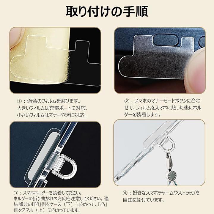 「2枚傷防止フィルム付き」:2枚傷防止フィルムを付属されて、大きいフィルムはホルダーが充電ポートに装着する前に、スマホの充電口の周りに貼ってください。