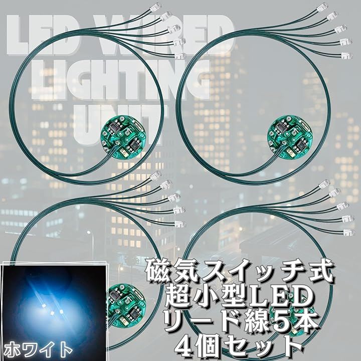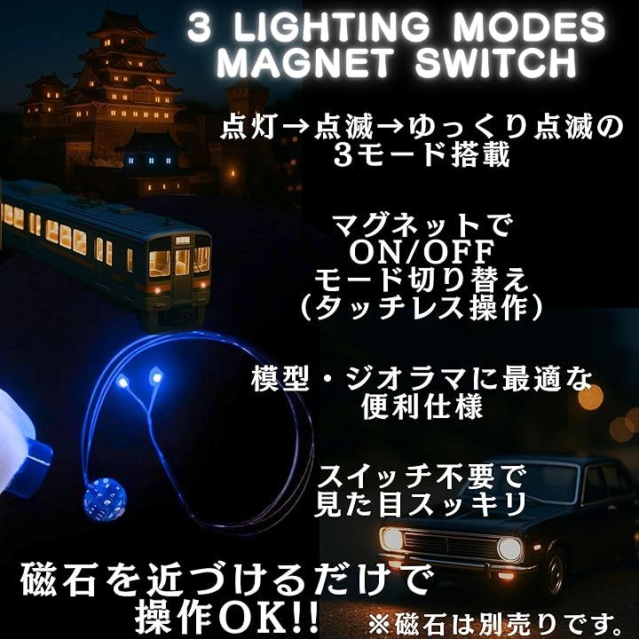 ・点灯:明るく安定した光で、ライト・内部発光・車両模型などに最適。 ・点滅:警告灯、サイレン、信号などの演出に。 ・ゆっくり点滅:呼吸するような柔らかい発光で、ロボット・フィギュア・ジオラマ演出にも好相性。 磁気スイッチ操作でモード切替できるため、 模型外側にスイッチを露出させる必要がなく、見た目を損ないません。