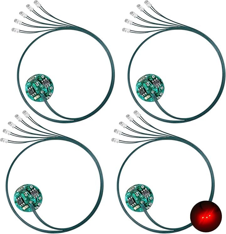 [商品詳細] ・リード線付き電飾 4個セット(個包装) ・基盤サイズ:直径 約11.2mm 厚さ 約5mm ・LEDサイズ:約 1.3x1.5mm ・リード線長さ:約19cm ・点灯モード:点灯/点滅/ゆっくり点滅 ・操作方法:磁気スイッチ式(磁石を近づけてON/モード切替/OFF) ・対応電池:CR927(別売り) *電池・磁石は付属していません。