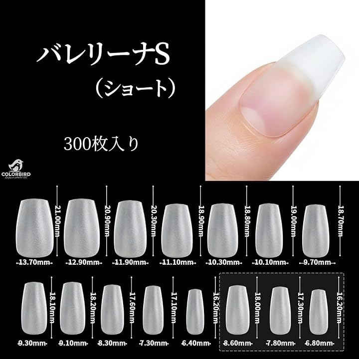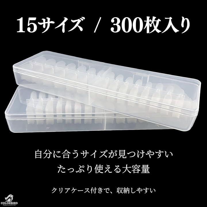 「材質」アクリル 「サイズ」15サイズ 「数量」300ピース(15サイズx2両手x10パレット) 「Tips」チップ先裏の数字がクリア系ネイル時に気になる場合は、数字にトップコートを塗っていただくとトップコートと一体化して数字が消えます。