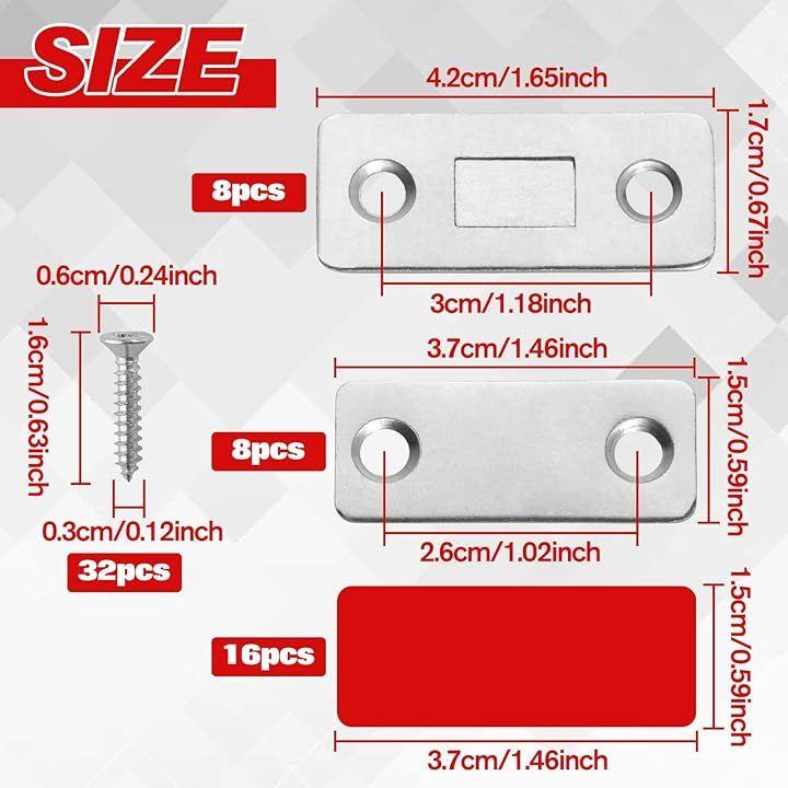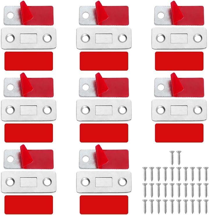 「セット内容」マグネット式キャビネットドアラッチ8個、ネジ32本、両面粘着ストリップ16本。