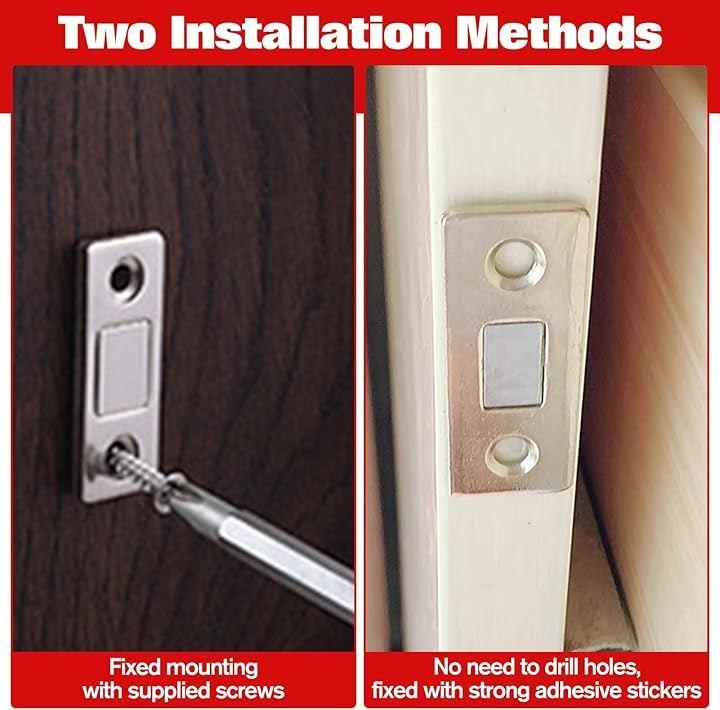 「取り付けが簡単」マグネット式キャビネットドアロックは、ネジや粘着テープを使って簡単に取り付けることができます。