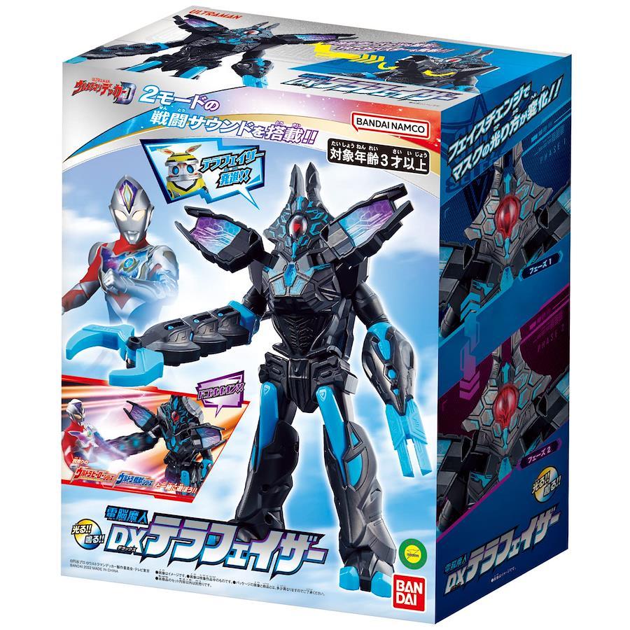 (c)ウルトラマンデッカー製作委員会・テレビ東京 『ウルトラマンデッカー』より、「電脳魔人 DXテラフェイザー」が登場! 全高約200mmの防衛隊の巨大ロボです。 フェイズチェンジでマスクが変化! 頭のダイヤルを回すとマスクが「フェーズ1」「フェーズ2」の2パターンに変化し、LEDの発光で模様が浮かび上がります。 さらに、本体にはハネジローのセリフを含む全19種類のサウンドを内蔵!ボタンを押すことで「フェーズ1」「フェーズ2」2モードそれぞれの劇中効果音が発動し、バトルシーンを再現して遊べます。 また、右腕のアームが伸縮&爪が開閉するマジックハンドギミックを搭載。別売りのウルトラソフビシリーズと一緒に遊べます。