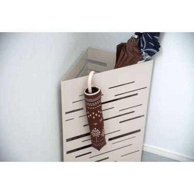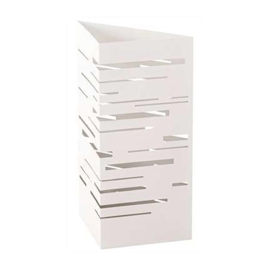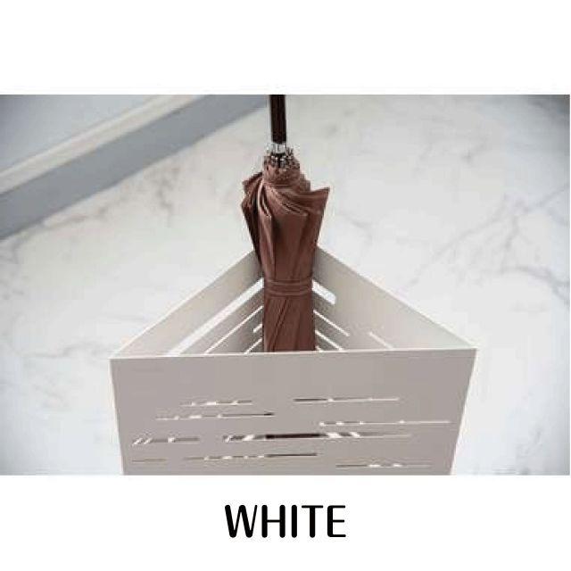 Umbrella stand, available in white and gray. Dimensions: 31cm (width) x 15.5cm (depth) x 49cm (height). Slim, space-saving, compact design. Made of steel. Features a rectangular or triangular shape. Stylish and simple design with a matte finish. Ideal for entryways. Includes slits.