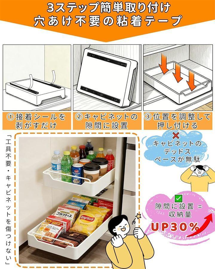 「賃貸OK」工具不要で30秒設置。シンク下死角を100%活用 シンク下の雑然をワンタッチで整理。専用強力両面テープで貼るだけ。