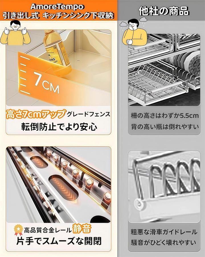 * 伸縮式設計で様々なサイズのシンク下にピッタリフィット * スムーズなスライド動作で奥の物も楽に取り出せる * 耐荷重・防水加工で長く清潔に使える * 取り付け簡単、工具付属でDIY初心者も安心 キッチンだけでなく、洗面台下、バスルーム、デスク下など、様々なシーンでご利用いただけます。