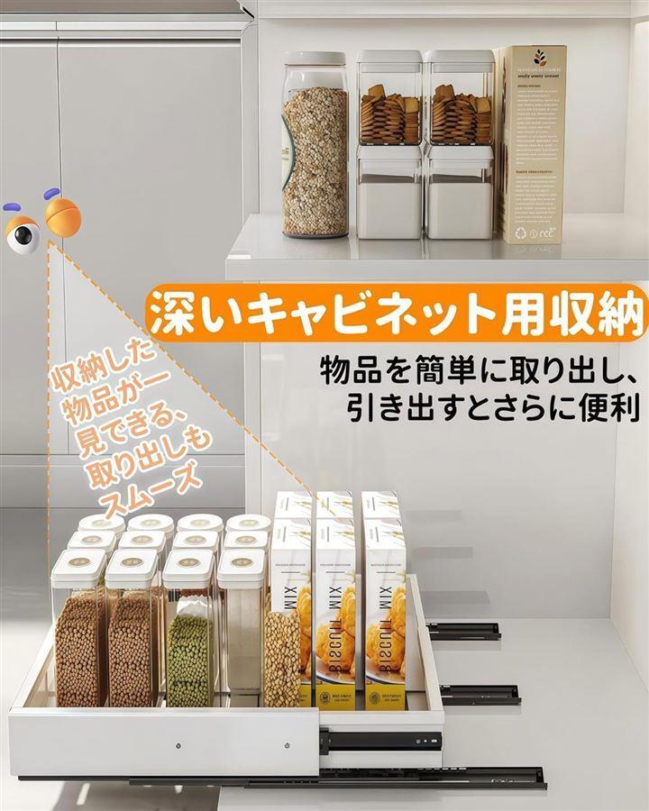 高耐久スライドレールが重い食器も軽やかに滑らせ、奥の物もワンタッチで取り出せます。