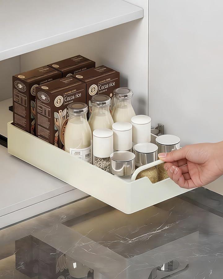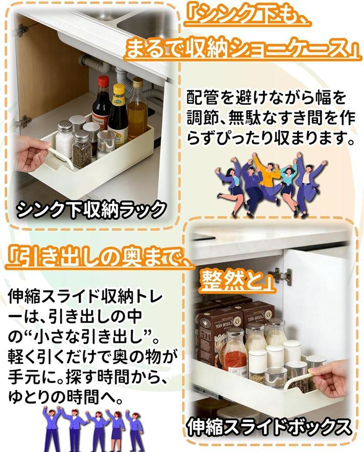 この収納ラックで、キッチンの収納環境を一変させましょう。 キッチンのシンク下、つい無駄になっていませんか? 「伸縮スライドボックス」は、その見逃しがちなスペースをスマートに活用する画期的な収納ソリューションです。