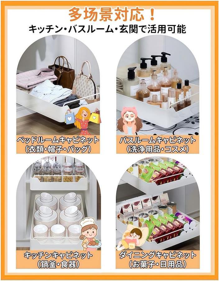 「家中まるごと収納」シンク下以外にも全シーン対応 キッチン以外でも大活躍。洗面台下のシャンプー・化粧品、トイレのトイレットペーパーストック、デスク下の文具収納まで。